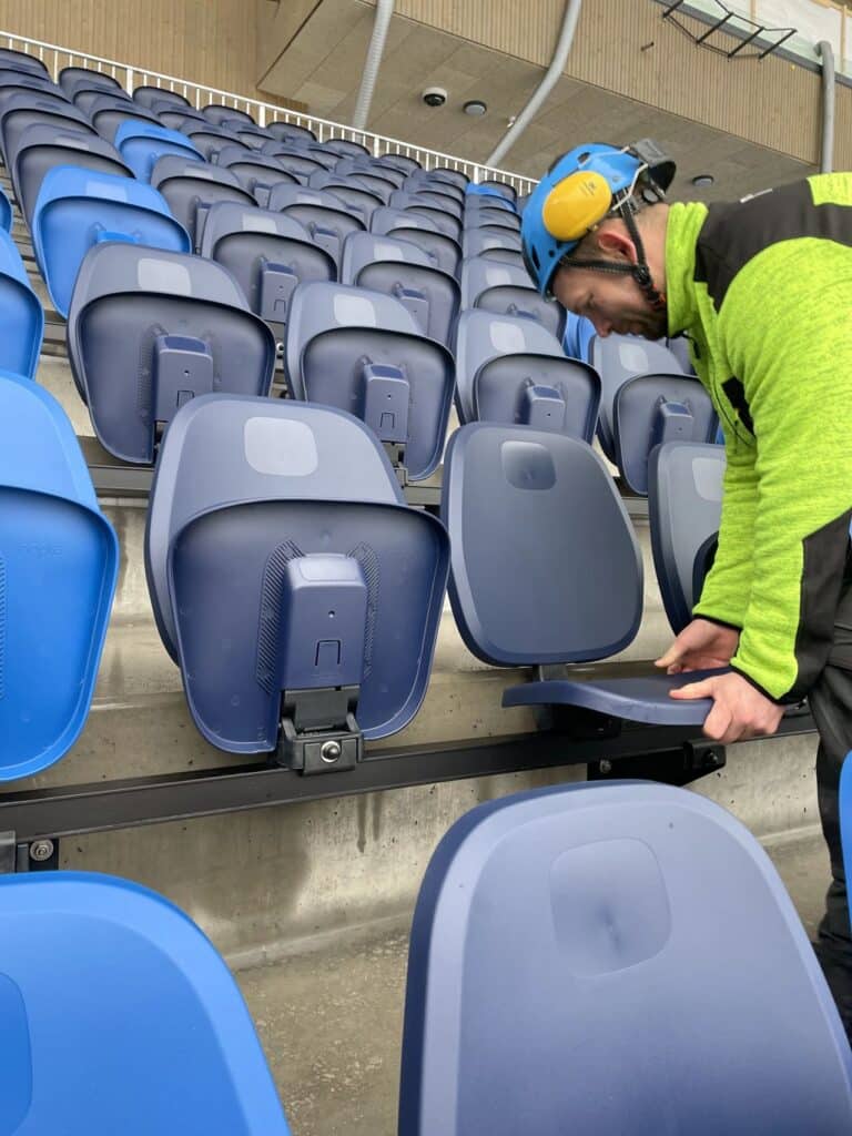 Også på Nadderud stadion utenfor Oslo, hjemmebane for Stabæk Fotball, fullfører Nopla Sport nå installasjonen av sine tribunestoler.